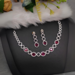 Embrace timeless elegance with this Aamrapali Mughal Era rose gold necklace and earring set with bracelet. This handcrafted masterpiece features intricate details and sparkling kundan stones, reminiscent of the Mughal era’s rich jewelry design tradition. The rose gold finish adds a touch of modern sophistication to the traditional design. The set is perfect for adding a touch of luxury to your everyday look or making a grand statement at any special occasion.